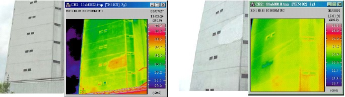 圖2:某醫(yī)院大樓存在嚴(yán)重的空股,左圖為維修前紅外圖像;圖右為維修后紅外熱像儀拍攝的圖像