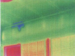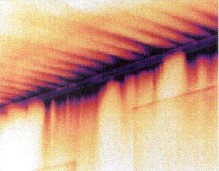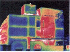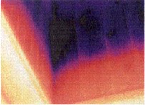 圖4:紅外檢測(cè)清楚的顯示樓房能量損失程度。樓齡為8年,紅外圖象顯示在墻體和房頂都有明顯的熱損失,基礎(chǔ)處也沒有隔熱處理。對(duì)樓頂進(jìn)行檢測(cè)發(fā)現(xiàn)天花板沒有安裝隔熱材料。房屋主人知道了熱損失程度,也確切理解了該采取措施進(jìn)行改進(jìn)。修補(bǔ)后可再用紅外檢測(cè)評(píng)估隔熱安裝的效果和質(zhì)量。