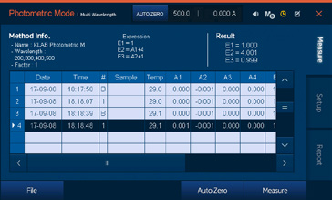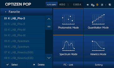 OPTIZEN POP共提供4種測量模式 (光度測量模式, 定量模式, 光譜模式, 動力學(xué)模式), 用戶可根據(jù)測量目的選擇使用相應(yīng)的模式。用戶可以利用設(shè)備中內(nèi)置的電腦軟件和觸屏界面, 應(yīng)用程序來簡便地使用設(shè)備。