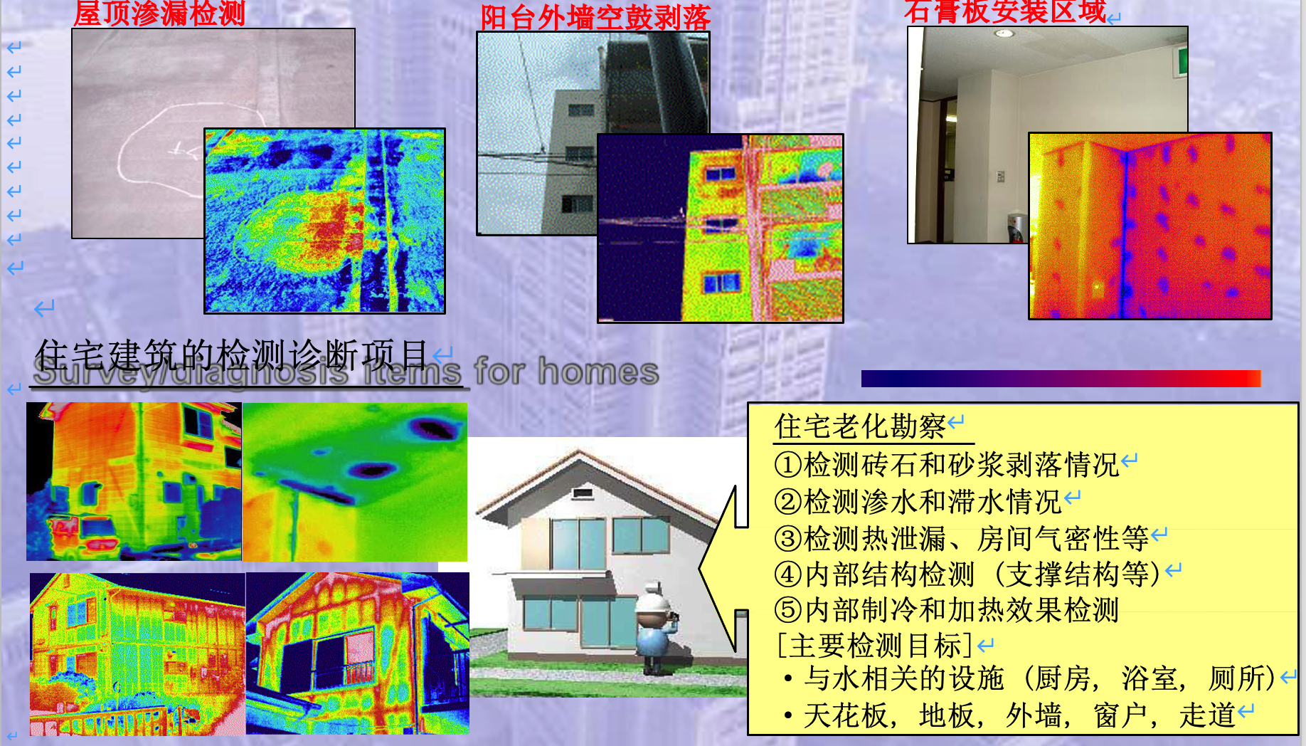 紅外檢測服務(wù)廣泛應(yīng)用于樓宇建筑的評估、維護(hù)、檢測和診斷。紅外檢測服務(wù)是一種能將物體的溫度分布可視化的設(shè)備,通過對溫度的可視化,可在短時間內(nèi)有效的進(jìn)行“外墻飾面材料的剝落或空鼓檢測”、“滲漏水或滯水檢測”、“材料保溫性能檢測”、“房間氣密性檢測”、“電氣設(shè)備、管道和空調(diào)的檢測”等。此外,紅外檢測服務(wù)在樓宇建筑的“節(jié)能效果檢測”手段中較為高效有用。