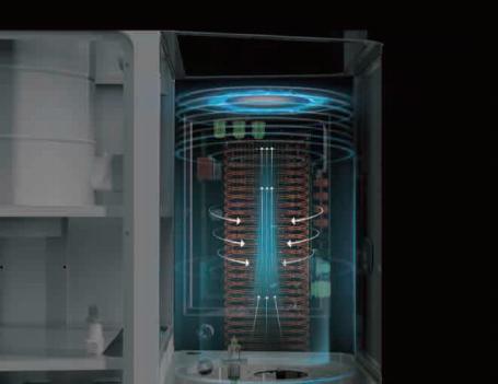 氣流,通過(guò)一種空氣動(dòng)力學(xué)導(dǎo)流葉片腔變成高速旋轉(zhuǎn)的螺旋氣流,達(dá)到每分鐘4000轉(zhuǎn),從而產(chǎn)生超過(guò)100倍于重力的離心力。99.7%的粉塵顆粒在此離